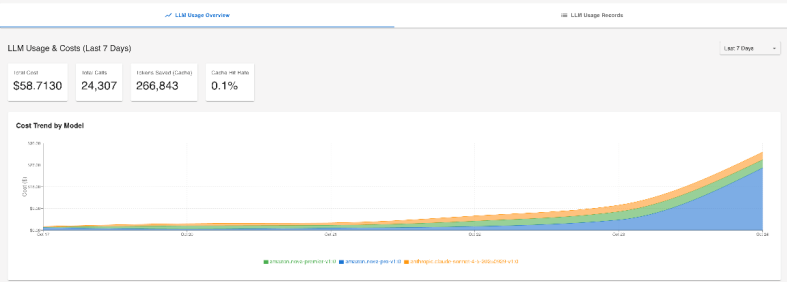 The default instance of Optimizer provides a dashboard of both summary and filtered views of LLM usage by processing environment, by service, by model and by account.